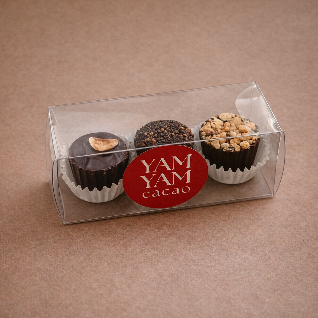 Nuestra caja de bombones es una invitación a descubrir la variedad de sabores que elaboramos. Cada bombón está hecho de manera artesanal, con chocolate belga y rellenos naturales.