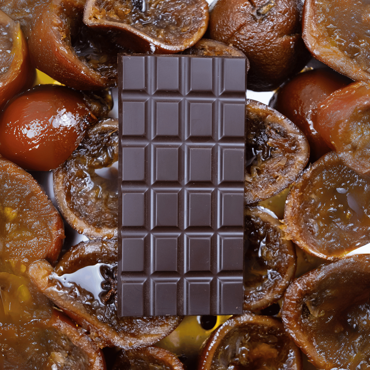 Naranja ecológica confitada lentamente en el obrador durante meses, que aporta un dulzor profundo y elegante, fusionándose con la intensidad del chocolate. Una tableta luminosa, intensa y muy cuidada.